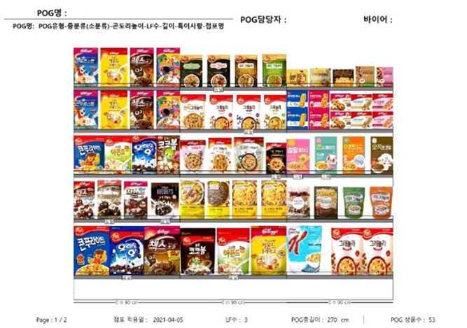 POG(Planogram)는 매장에서 상품을 어떻게 진열할지를 설계한 ‘진열 계획도’입니다. 단순히 상품을 나열하는 것이 아니라, 어떤 상품을 어느 위치에, 몇 개를, 어떤 높이에 배치할지를 구체적으로 정한 설계 문서입니다. 대형마트에서는 보통 월 2회 정도 POG가 변경되며, 매장은 이 설계도를 기준으로 기존 진열을 철거하고 다시 재구성합니다. 즉, POG가 바뀐다는 것은 매장의 판매 전략이 다시 설계된다는 의미이기도 합니다.