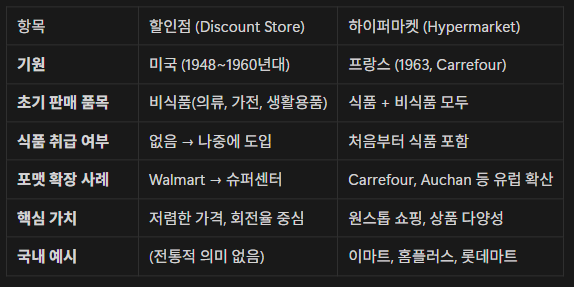 반면 하이퍼마켓은 유럽에서 시작된 개념입니다. 1963년 프랑스의 Carrefour가 처음 도입한 모델로, 식료품과 비식품을 한 공간에 통합한 대형 매장 형태였습니다. 그 이전에는 식품은 슈퍼마켓, 비식품은 백화점이나 할인점에서 각각 구매해야 했습니다. 하이퍼마켓은 이 분리된 구조를 하나로 합쳤습니다. 식품과 공산품을 함께 판매하면서 소비자에게 ‘시간 절약’과 ‘편의성’이라는 가치를 제공했습니다. 즉, 할인점이 ‘가격 중심’에서 출발했다면, 하이퍼마켓은 ‘카테고리 통합’에서 출발한 포맷이라고 볼 수 있습니다. 이후 미국의 Walmart 역시 1980년대 후반부터 식품을 포함한 Supercenter 모델로 확장합니다. 이는 기존 할인점이 하이퍼마켓 형태로 진화한 사례입니다. 오늘날 Walmart Supercenter는 사실상 하이퍼마켓 구조에 가깝습니다.